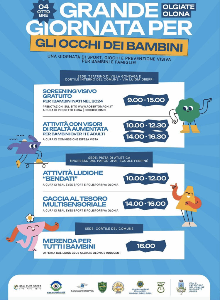 Olgiate Olona, bambini, screening visivo gratuito. In occasione della Giornata Internazionale della Vista, celebrata ogni anno il secondo giovedì di ottobre, OcchideiBimbi, Commissione Difesa Vista ETS e l’Associazione Real Eyes Sport daranno vita a un’iniziativa che punta a valorizzare il bene vista nello sport: il Teatrino di Villa Gonzaga e la pista di atletica di Olgiate Olona ospiteranno un evento speciale dedicato alla salute visiva dei bambini e al valore dell’inclusione il prossimo 4 ottobre.