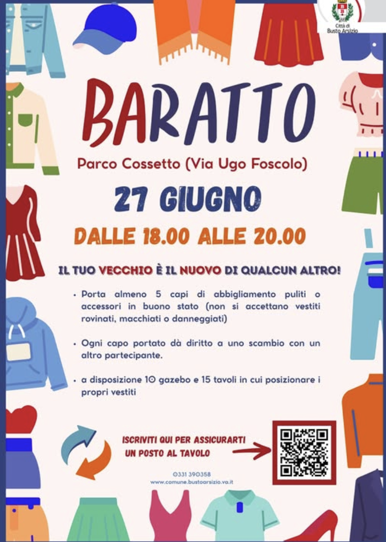 Busto Arsizio, “Ba-Ratto”, 1a edizione al parco, Venerdì 27 giugno, dalle 18.00 alle 20.00, il parco Norma Cossetto di via Ugo Foscolo ospiterà il primo “Ba-Ratto” della città, un evento innovativo dedicato allo scambio di abiti e accessori.