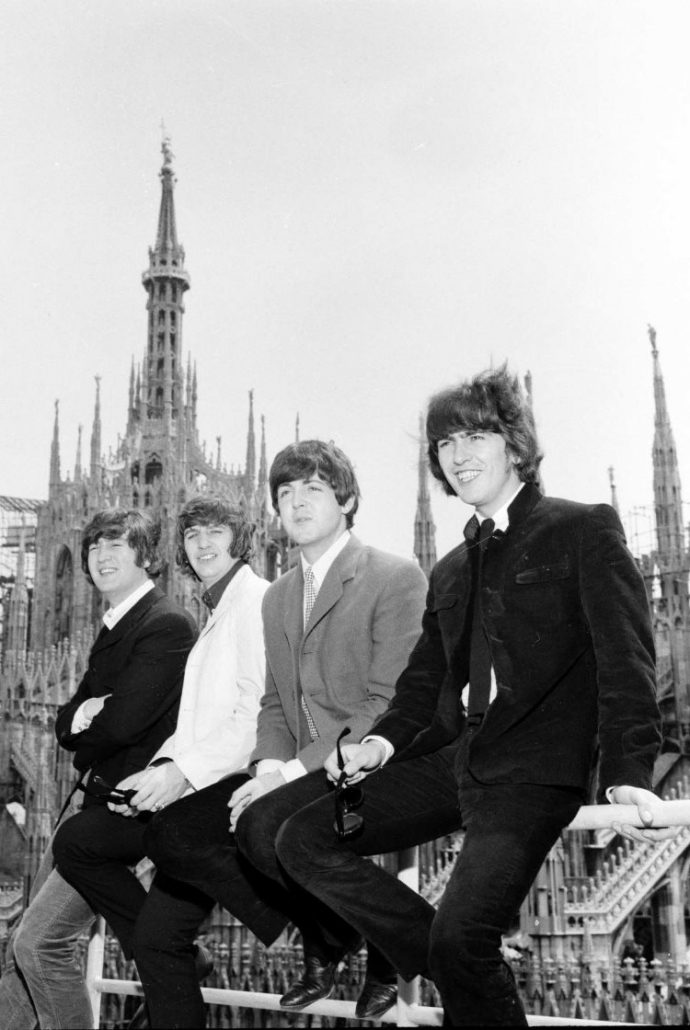 I Beatles ritratti sulla terrazza del Grand Hotel Duomo; sullo sfondo la cattedrale, Milano, 24 giugno 1965