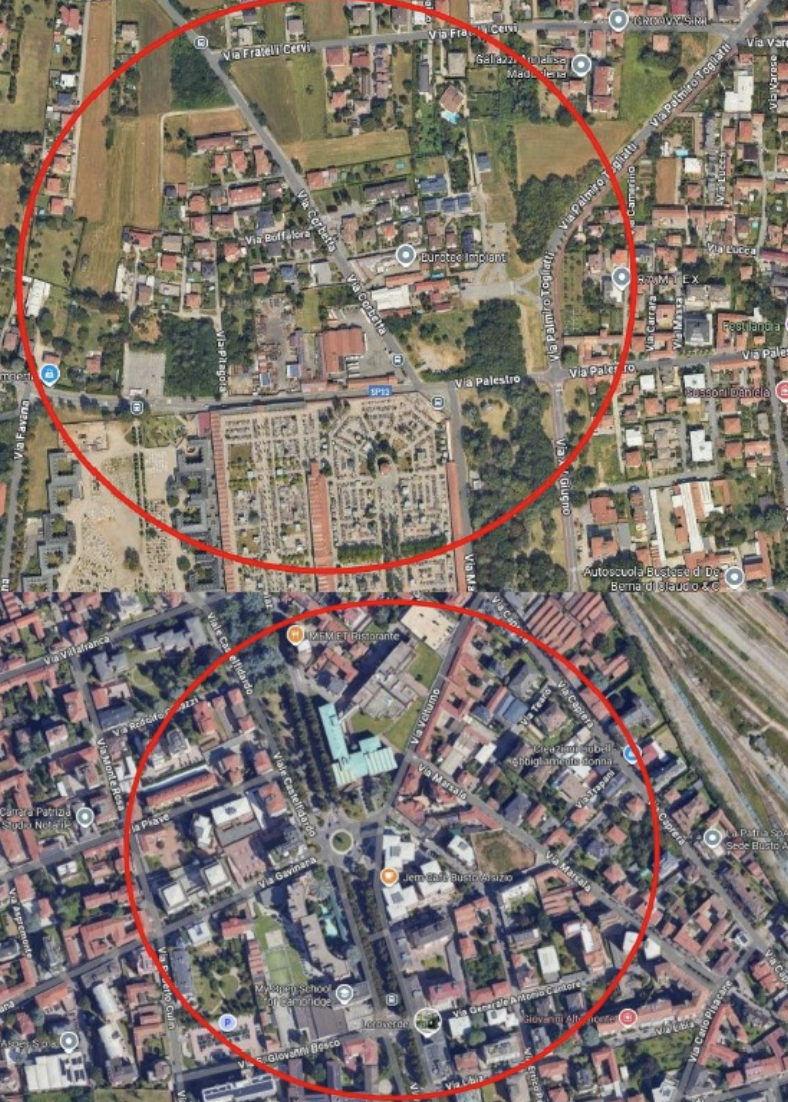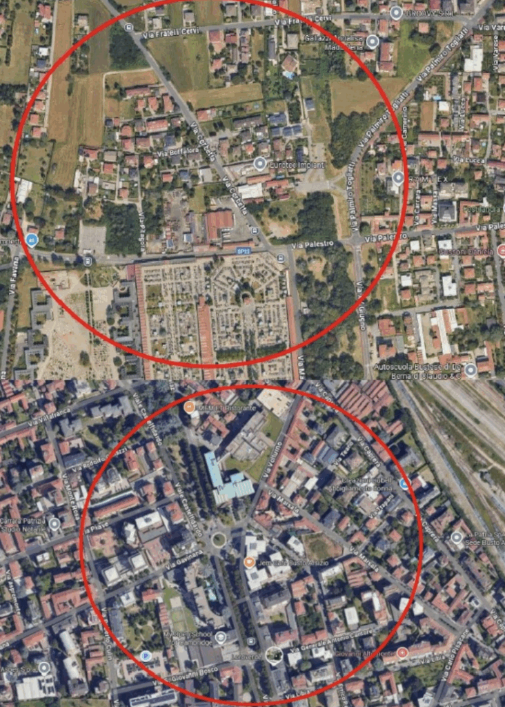 Via Corbetta (dall’intersezione con via Comalone verso il Cimitero), via Fratelli Cervi (fino all’intersezione con via della Gazzella), via della Rondine, via del Capriolo (angolo con via Fratelli Cervi), via del Daino (angolo con via Fratelli Cervi), via Boffalora Ticino, via Pitagora, Strada Comunale per Samarate (dall’incrocio con via Corbetta fino all’intersezione con via Favana), via Sommacampagna (angolo con via Palestro), via Palestro (dall’incrocio con via Corbetta fino all’intersezione con via Camerino), via Palmiro Togliatti (dall’intersezione con via Camerino verso via XV Giugno), via Camerino, via Malpighi, via XV Giugno.