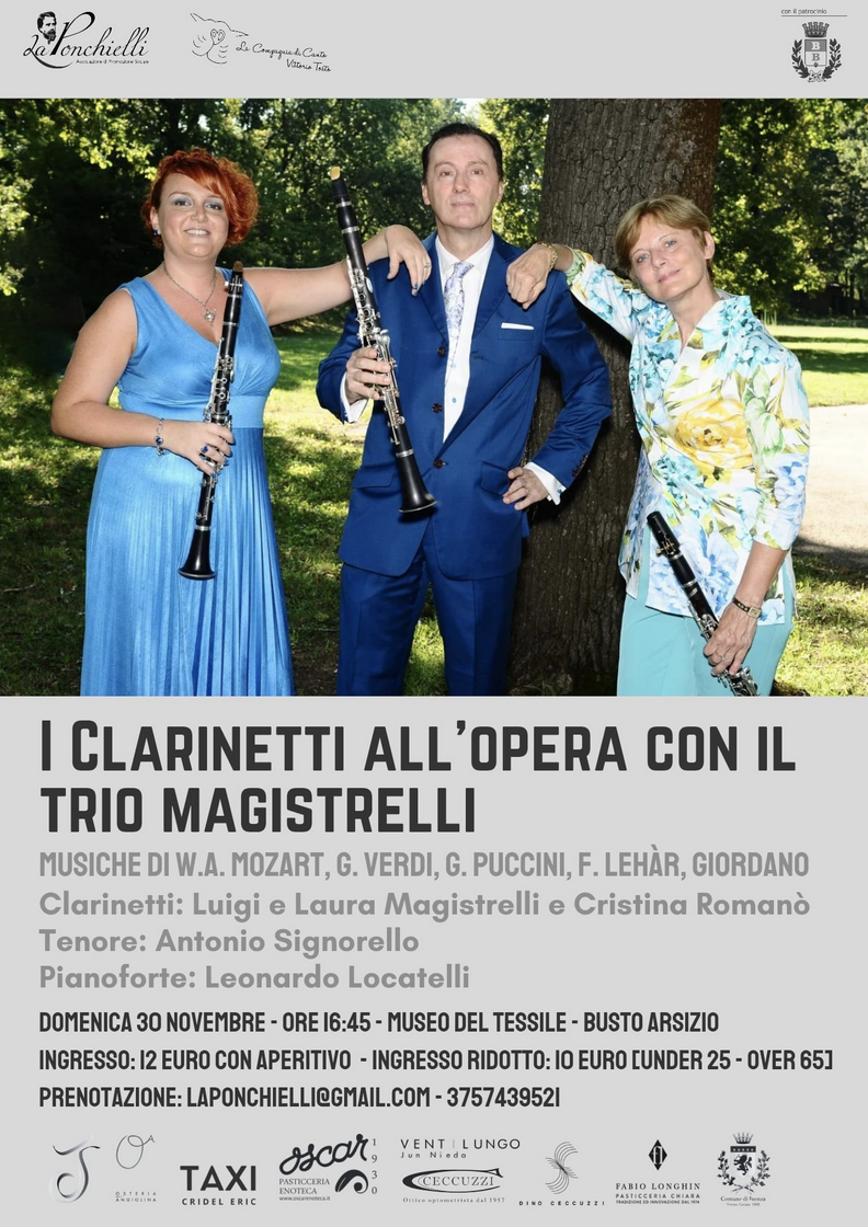 Busto Arsizio, La Ponchielli ETS-APS , La Ponchielli ETS-APS , “clarinetti all’opera!”. Domenica 30 Novembre alle ore 16.45 presso la Sala Conferenze del Museo del Tessile è in programma un nuovo appuntamento musicale organizzato de La Ponchielli ETS-APS con il patrocinio dell’Amministrazione Comunale.