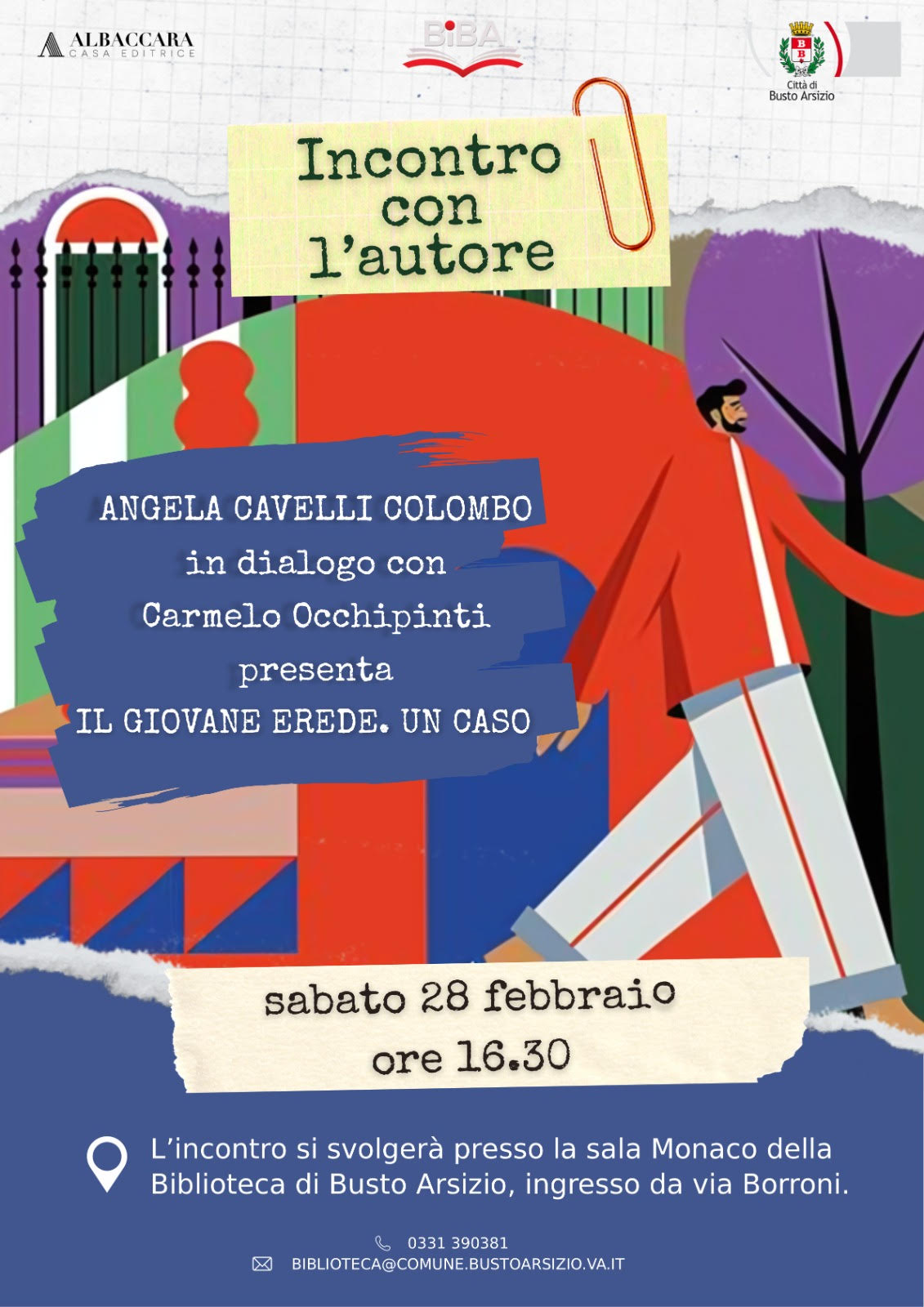 L’incontro con l’autrice Angela Cavelli Colombo a Busto Arsizio rappresenta uno degli appuntamenti culturali più attesi di fine febbraio. L’incontro con l’autrice Angela Cavelli Colombo si terrà sabato 28 febbraio alle 16.30 nella sala Monaco della Biblioteca cittadina, con ingresso da via Borroni. L’incontro con l’autrice Angela Cavelli Colombo offrirà al pubblico l’occasione di scoprire il suo nuovo libro Il giovane erede. Un caso, in dialogo con il professor Carmelo Occhipinti.