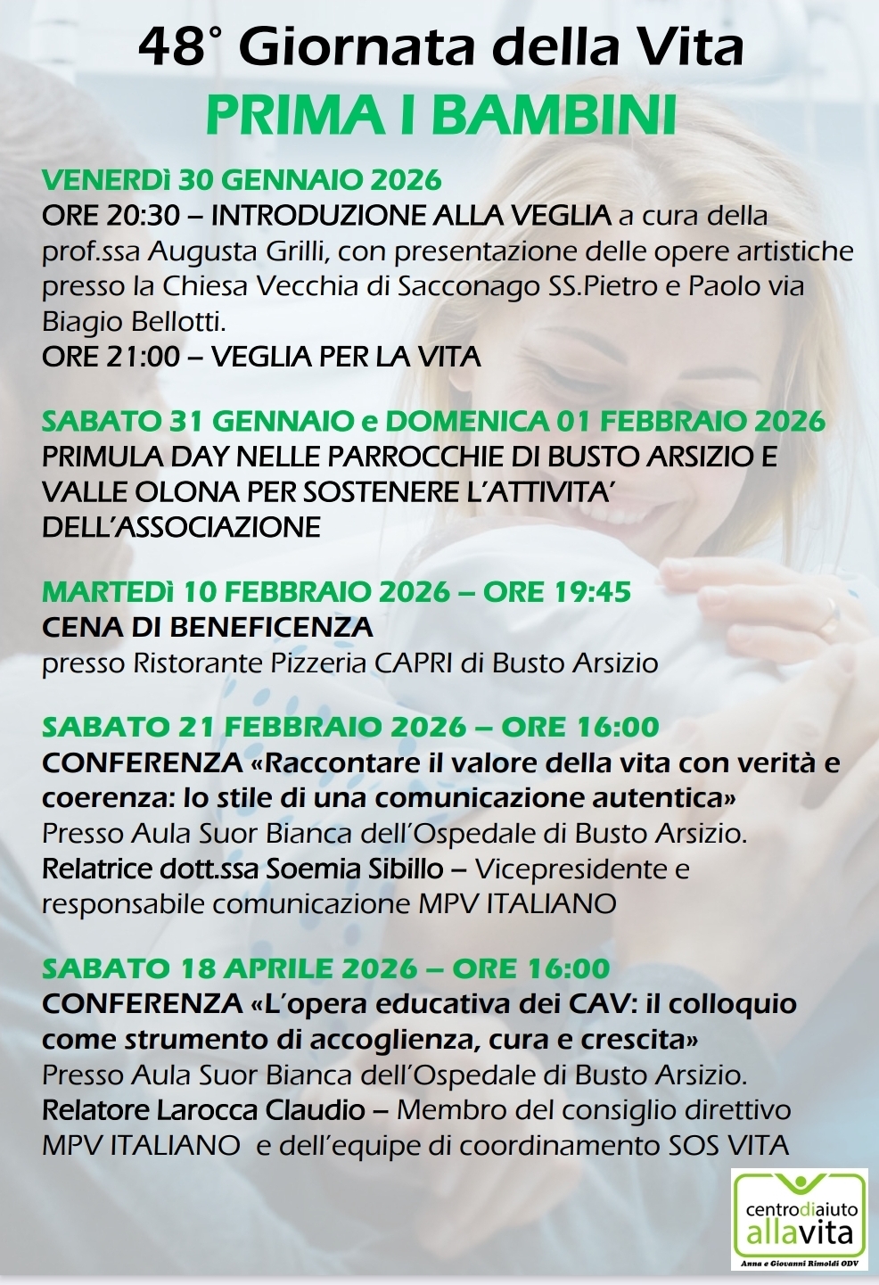 Scopri il programma della 48° Giornata della Vita organizzata dal Centro di Aiuto alla Vita “Anna e Giovanni Rimoldi” di Busto Arsizio. Incontri, conferenze e solidarietà.