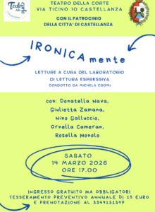 il Laboratorio di Lettura Espressiva condotto da michela cromi propone IRONICA-mente, lettura di coinvolgenti testi ironici di Mattia Torre, per ridere e riflettere insieme, con il Patrocinio della Città di Castellanza.