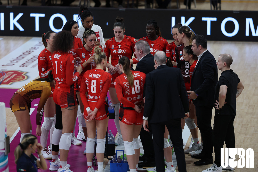 La  UYBA ha perso 3 a 1 con i parziali 26-24, 25-22, 22-25, 25-21, nonostante i 22 punti di Josephine Obossa e i 16 di Melanie Parra. A fare la differenza sono stati probabilmente i 22 errori di squadra contro i 14 delle padrone di casa.