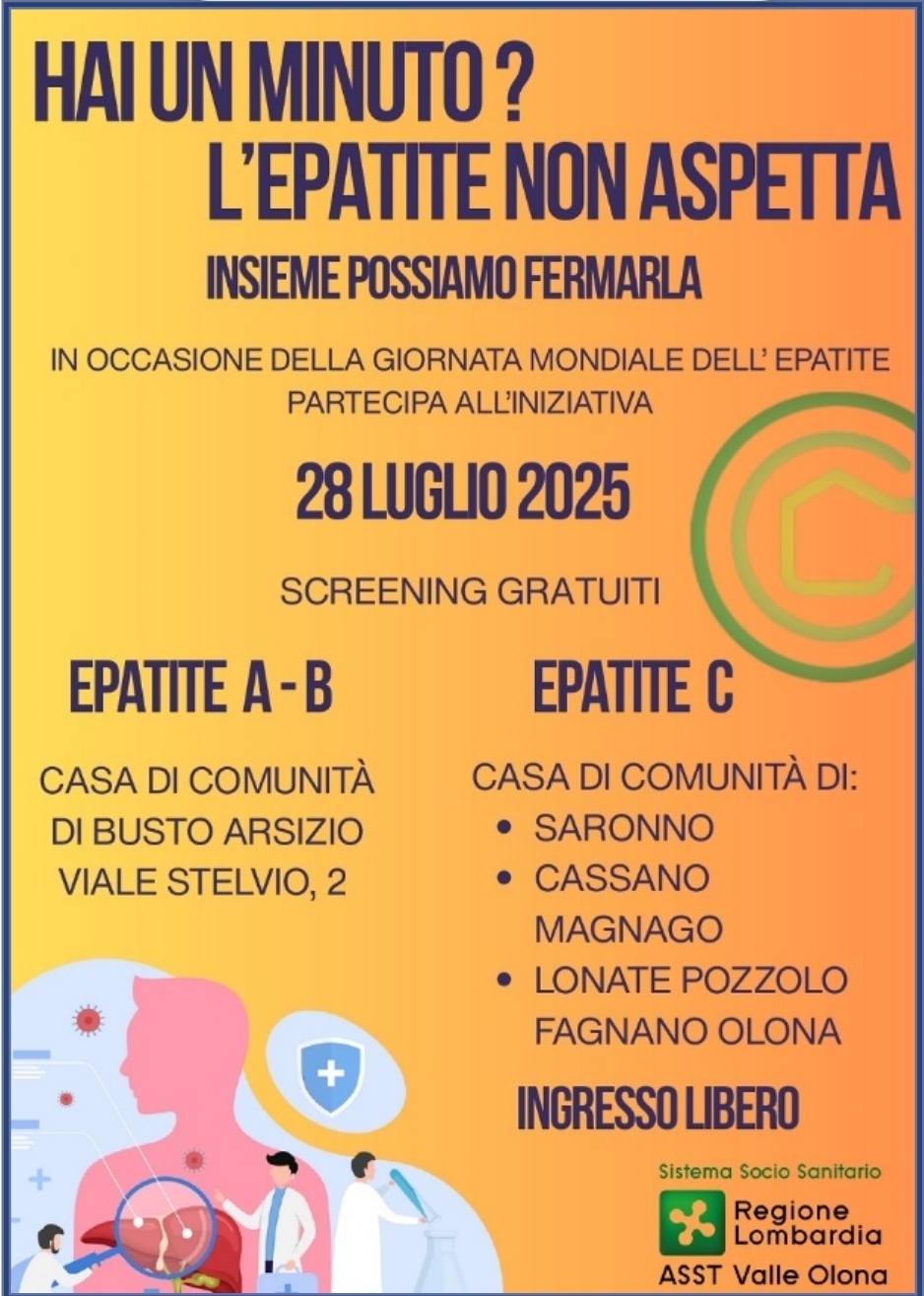 Screening epatite ASST Valle Olona: lunedì 28 luglio 2025, in occasione della Giornata Mondiale contro l’Epatite, le Case di Comunità del territorio offriranno screening gratuiti alla popolazione. L’iniziativa, promossa con il claim “Hai un minuto? L’epatite non aspetta”, punta sulla prevenzione e diagnosi precoce delle epatiti A, B e C.