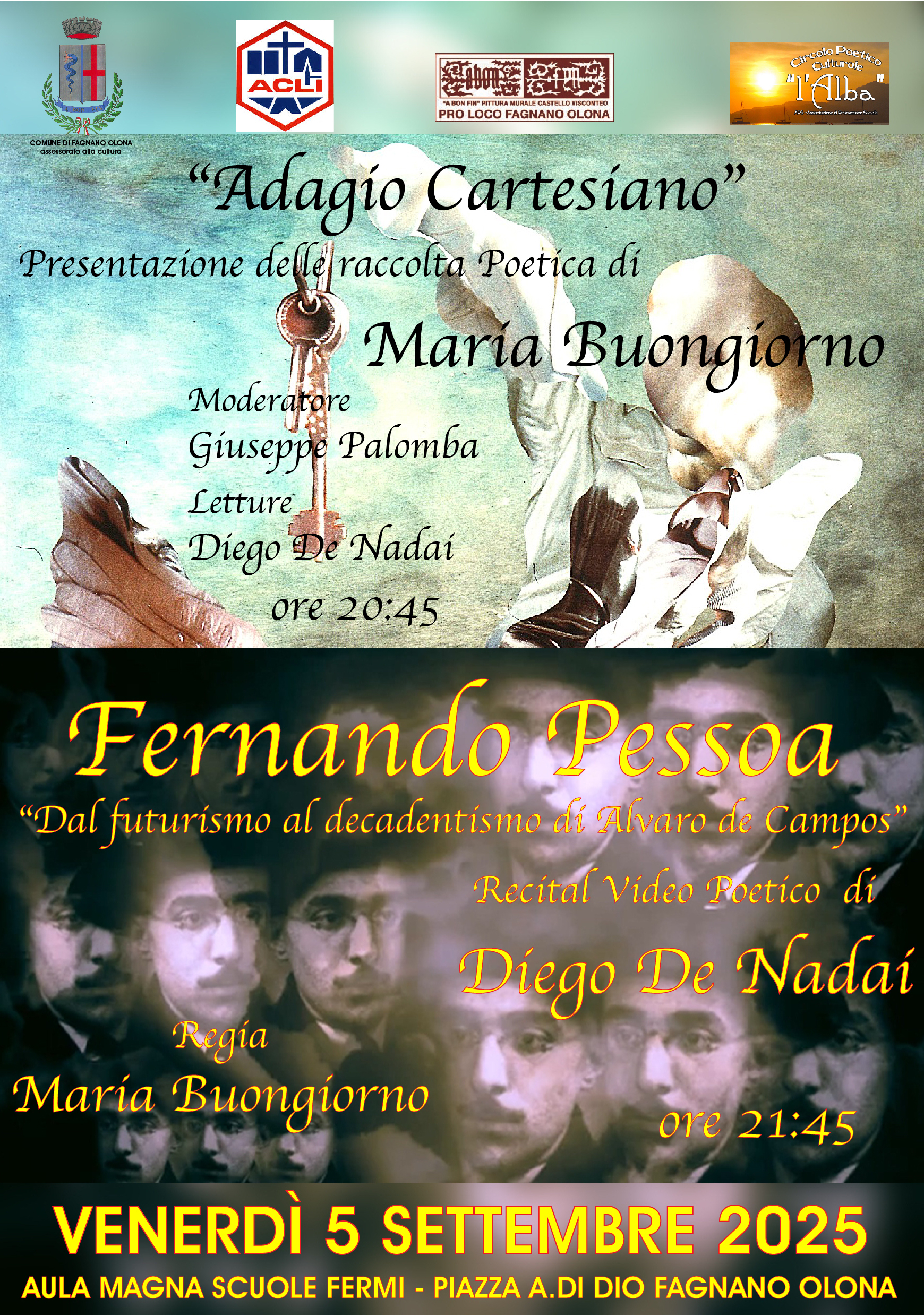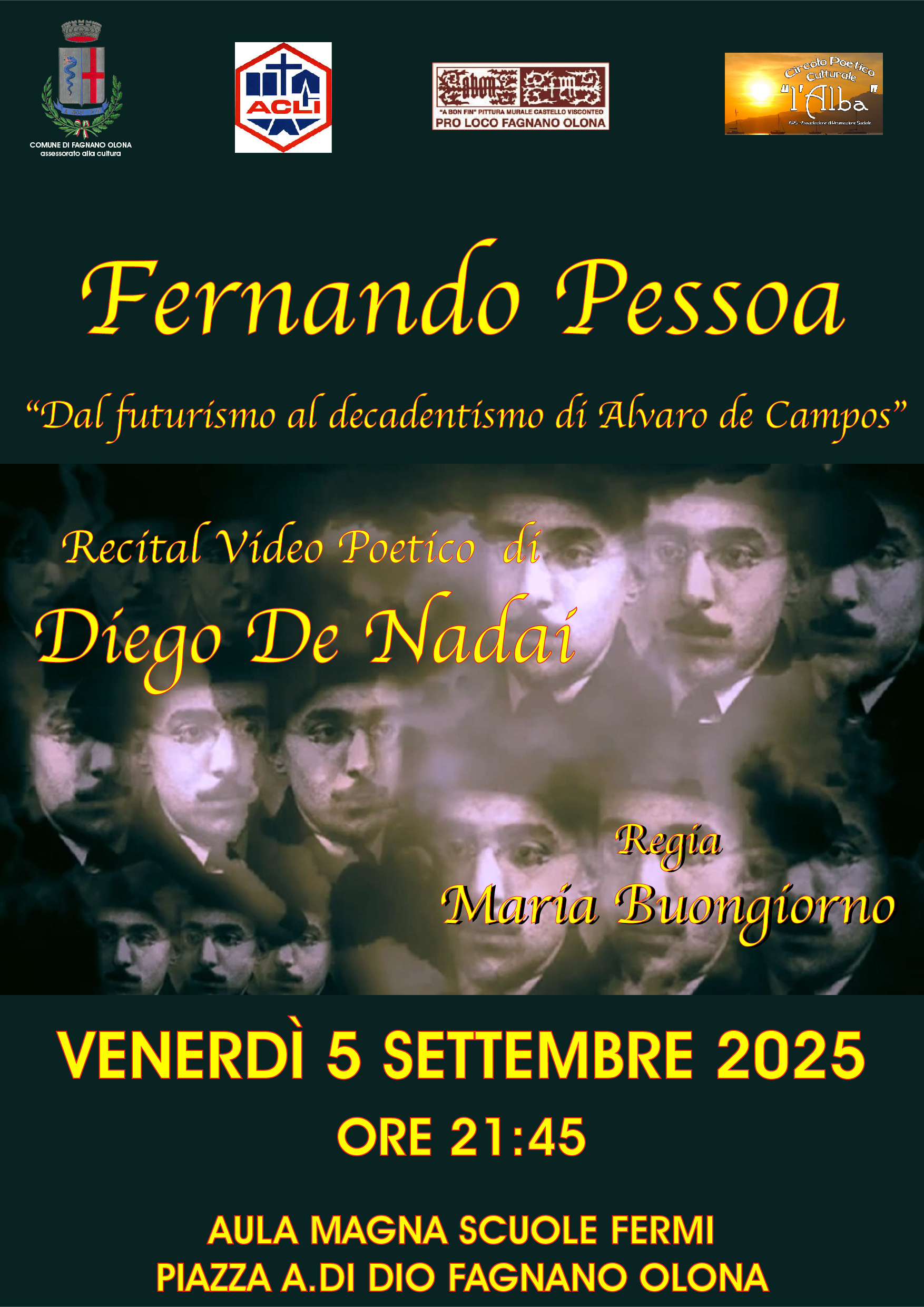 Dopo 8 anni, Fernando Pessoa ritorna a Fagnano Olona con il “Libro dell’inquietudine” il prossimo venerdì 5 settembre 2025 alle ore 20.45 presso l’aula magna della scuola media Enrico Fermi. Il recital video poetico sarà preceduto dalla presentazione della raccolta di poesie “Adagio cartesiano” di Maria Buongiorno.