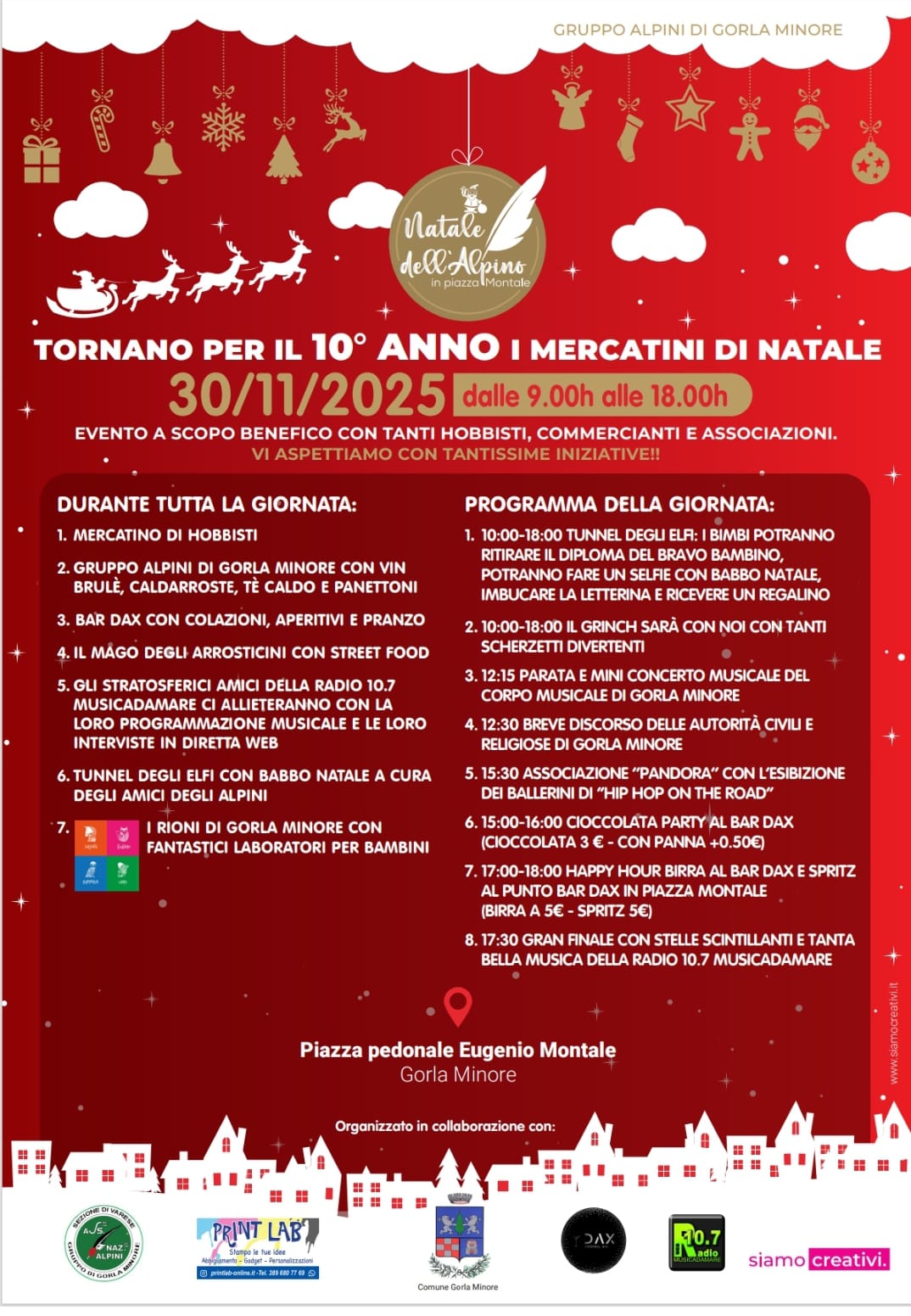 Il 30 novembre 2023 torna l’appuntamento più atteso dell’inverno: la 10° edizione dei mercatini di Natale in Piazza Montale a Gorla Minore. Un evento organizzato dal Gruppo Alpini, in collaborazione con il Comune, che ogni anno regala emozioni e atmosfera natalizia.