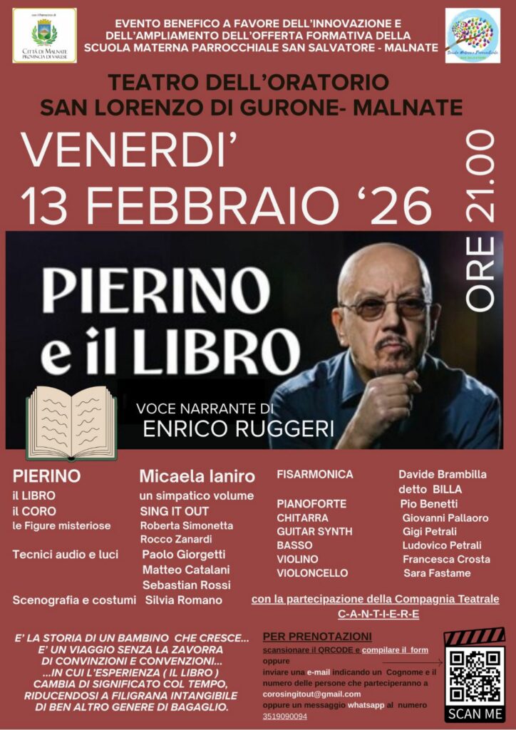 L’evento Pierino e il Libro arriva a Malnate con una serata unica, emozionante e profondamente solidale. Venerdì 13 febbraio 2026, alle ore 21:00, il Teatro dell’Oratorio San Lorenzo di Gurone ospiterà uno spettacolo che unisce musica, narrazione e teatro, con la voce narrante di Enrico Ruggeri. La parola chiave Pierino e il Libro è centrale perché rappresenta il cuore dell’iniziativa: un racconto evocativo che diventa strumento di comunità e sostegno concreto.