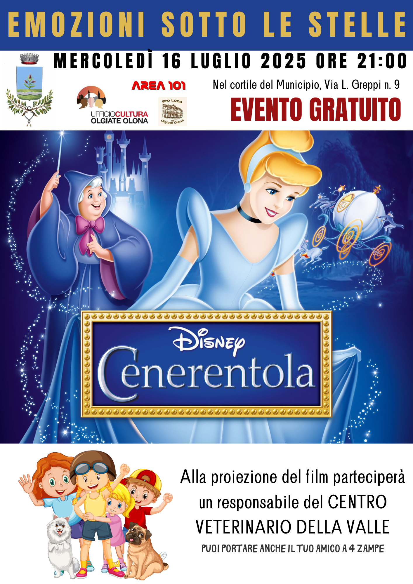 L’appuntamento è per mercoledì 16 luglio 2025. L’orario è alle 21:00. La location è il Cortile del Municipio di Olgiate Olona. L’ingresso è libero. E l’evento è pensato per essere davvero aperto a tutti. Compresi i nostri amici a quattro zampe. L’evento è pet friendly. Sarà presente anche un responsabile del Centro Veterinario della Valle. Questo per garantire la sicurezza e il benessere degli animali presenti. In caso di maltempo, la proiezione si sposterà al Teatrino di Villa Gonzaga, in via L. Greppi 11.