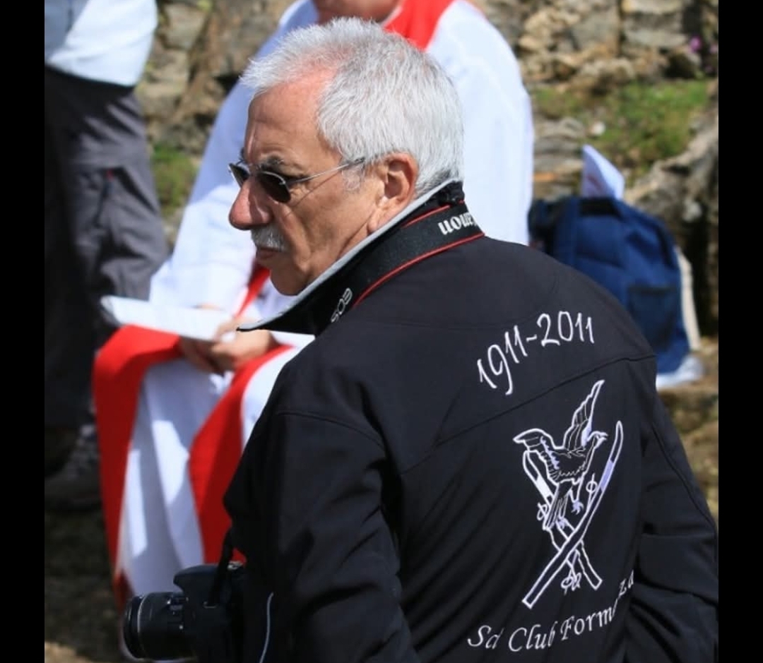 Somma. L’immagine che ci ritrae lo vede, con la sua inseparabile macchina fotografica, testimone e narratore degli eventi. La giacca, con il logo di un antico sci club e le date “1911-2011”, evoca un passato ricco di storia e passione, tratti che caratterizzavano anche il suo operato. È un dettaglio che sottolinea la sua connessione profonda con le tradizioni e le radici locali.