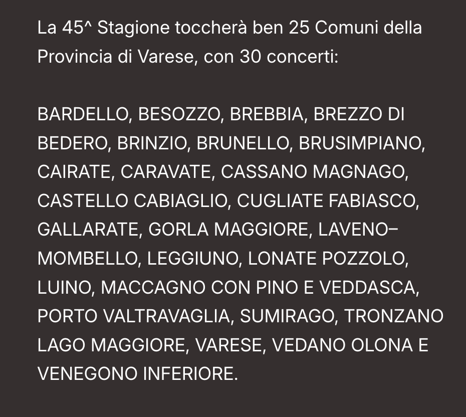 La direzione artistica, curata dal Dott. Mario Manzin e dalla Prof.ssa Irene De Ruvo, ha annunciato una programmazione di alto livello anche per il 2025, con 30 concerti da luglio a ottobre 2025 in 25 diversi comuni del territorio varesino.