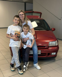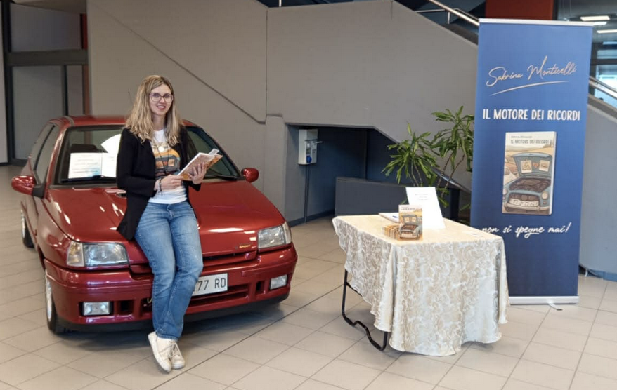 Al suo fianco la Renault Clio 16V, una delle auto che vive tra le pagine del libro Il motore dei ricordi.